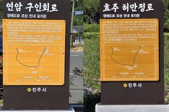 특히 ‘연암구인회로’와 ‘효주허만정로’는 진주시가 최초로 부여하는 명예도로명으로 알려졌다. 진주시에 따르면 ‘연암구인회로’는 지수면 지수로 일부 구간인 상동마을 입구에서 승산교까지이며, ‘효주허만정로’는 지수면 용봉로 일부 구간인 GS칼텍스 입구에서 상동마을 입구까지 조성되어 있다.