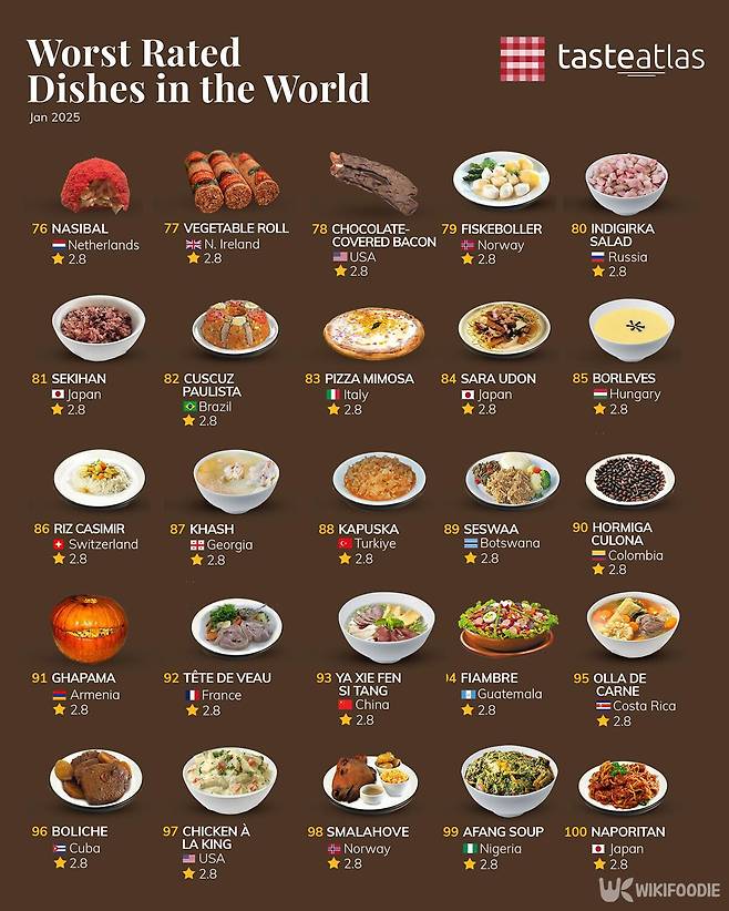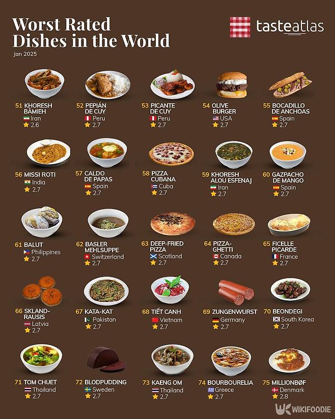 세계적인 미식 가이드 ‘테이스트아틀라스’가 발표한 ‘세계 최악의 음식 100가지’ 리스트에서 한국 음식 두 가지가 포함돼 눈길을 끌었다. 지난달 11일 테이스트아틀라스 인스타그램에는 각국의 논란이 되는 음식들이 순위에 올랐다. 그중 일부는 의외의 평가를 받았다. 특히 이번 리스트에는 예상치 못한 한국 음식들이 포함돼 화제를 모았다.