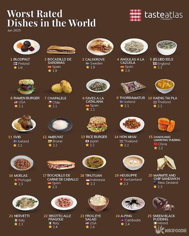 전체 리스트에서 1위는 핀란드의 ‘블러드팔트’였다. 호밀가루와 돼지고기 또는 소고기 피를 넣어 만든 반죽을 팬이나 오븐에서 조리한 음식이다. 2위는 스페인의 ‘정어리 샌드위치’가 차지했다. 빵 사이에 정어리와 고추, 토마토, 양파 등을 넣어 만들지만, 강한 비린 맛 때문에 호불호가 갈린다.