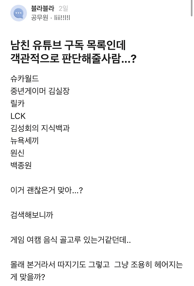 남친 유튜브 구독 목록보고 헤어지려는 여자