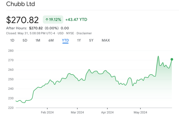13F에 따르면 버크셔는 67억달러 규모인 처브 주식 약 2590만주를 보유하고 있었고 이는 처브 전체 지분 6.4%에 해당됩니다. 버크셔는 처브의 2위 주주로 올라섰고 버크셔 포트폴리오에서 처브는 2%, 즉 아홉 번째 비중을 차지하게 됐습니다. 버크셔의 투자 사실 공개 후 처브 주가는 급등했고 최근 최고치를 경신했습니다. 처브는 지난 한 달 동안 약 8%, 올해 들어서는 19% 상승했습니다.