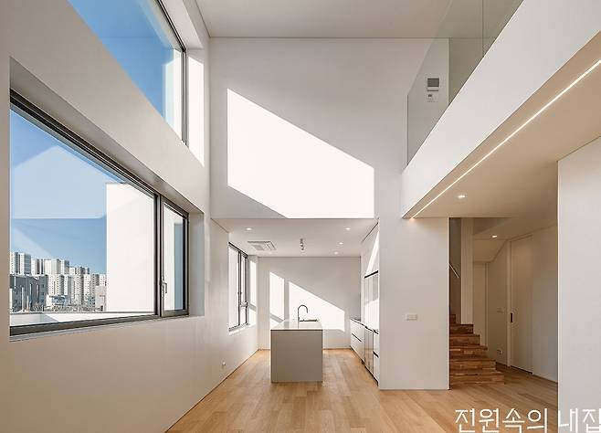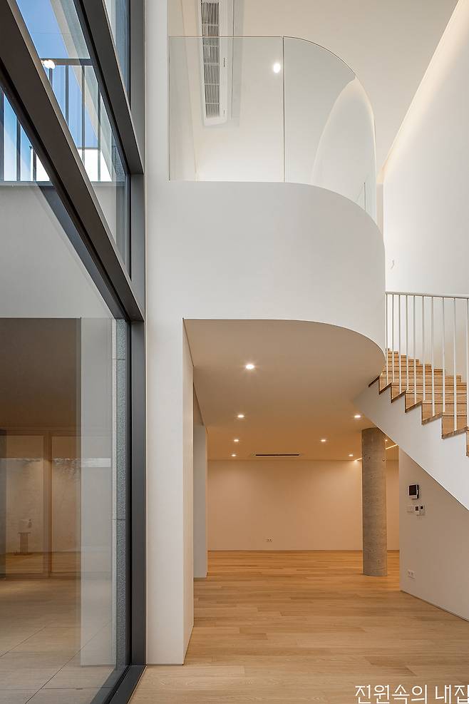 2층 세대는 대지의 오른편에서 필로티 하부로 접근하여 진입한다. 현관과 이어진 계단을 통해 올라가면 상부가 오픈된 거실을 마주하게 된다. 거실과 주방은 하나로 연결돼 공간을 더 길고 시원하게 사용할 수 있다. 남쪽을 향한 창들은 1층 세대와 시선이 마주치지 않도록 창호 하단 높이를 높였다. 대신 시선 위쪽으로 거실 상부 오픈 높이까지 창호를 크게 두어 하늘로의 시선을 개방하였다.