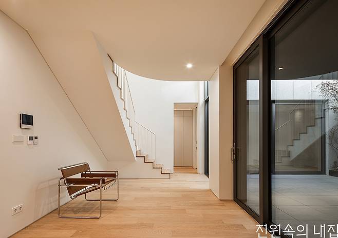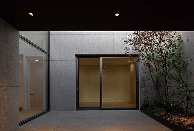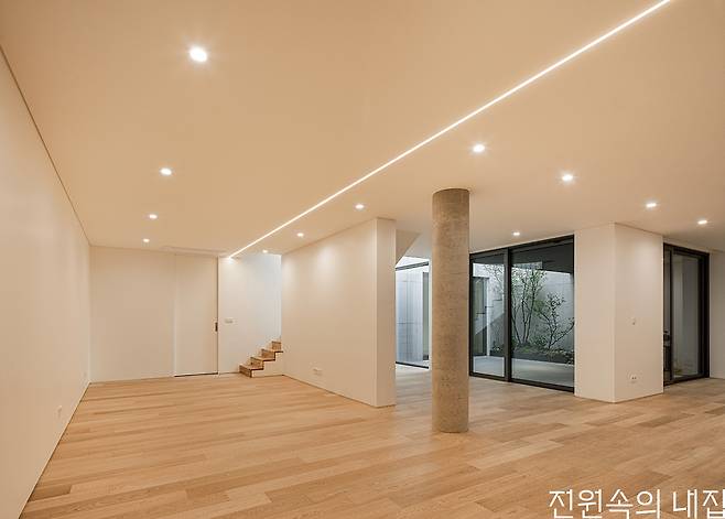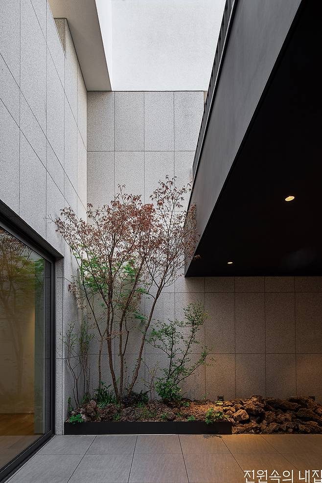 1층과 지하층을 사용하는 세대는 엇갈려 서 있는 벽 사이를 통하여 진입하게 된다. 내부 공간은 주차장 공간으로 열려 있는 전면 레이어와 인접지에 면한 후면 레이어로 구성된다. 전면 레이어에는 손님을 응대하거나 차를 즐길 수 있는 홀, 그리고 하부로 오픈된 보이드를 향한 계단이 있다. 후면 레이어에는 주방과 식당, 가장 깊숙이 침실이 자리 잡고 있다. 지하층으로 오픈된 계단을 통해 내려가면 수직적 공간감을 느낄 수 있다. 이 수직적 공간이 더욱 극적으로 다가올 수 있도록 두 개 층 높이의 커다란 창호를 두었고 그 너머로는 지하 선큰으로 들어오는 빛이 벽, 조경과 어우러지며 특유의 분위기를 만든다.