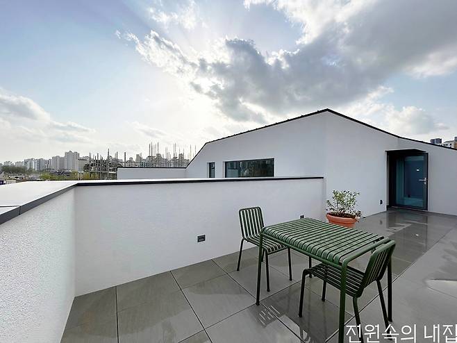 다락으로 올라가는 계단과 안방 침실이 만나는 부분에는 작은 홀을 두었다. 그리고 이 홀에 맞닿은 발코니를 두어 공간의 여백을 만들었다. 이 여백은 작은 마당을 제공하고 가장 사적인 공간인 안방 공간이 조금 거리를 두고 자리할 수 있게 한다. 다락으로 올라가면 아래층 거실로 열린 오픈부와 전면 하늘로 열린 큰 창호가 공간의 개방감을 준다. 다락의 낮은 부분은 제작 가구를 설치하여 좌식으로 사용할 수 있는 작은 서재로 기능한다. 다락에서 하늘마당으로 나가면 시원하게 뻗어 있는 데크와 그 너머 남한산성 자락이 보이는 탁 트인 경관을 마주하게 된다.