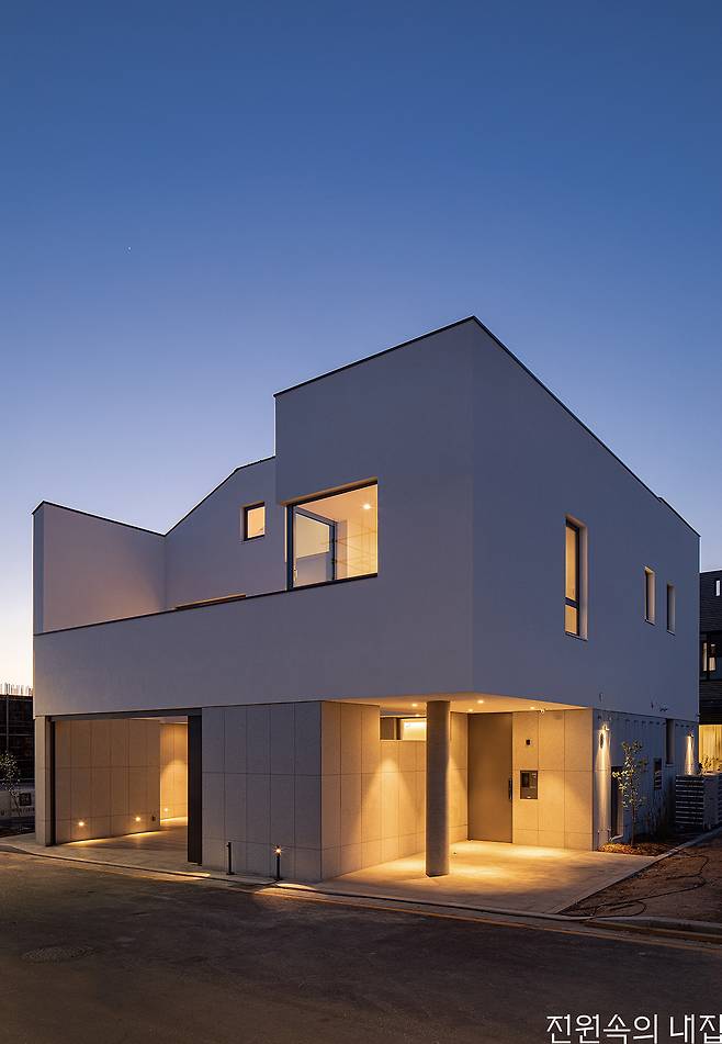 ‘다온‘은 북위례 단독주택 택지지구에 위치한 2세대가 함께 사는 단독주택이다. 택지지구의 땅들이 으레 그렇듯 이웃으로부터의 프라이버시를 확보하고 단독주택으로서 가질 수 있는 매력적인 공간을 담아내는 것이 건축적으로 해결해 나갈 과제였다. 이로써 각각의 세대는 완전히 독립적인 공간으로 나눠 서로 마주치지 않고 각 세대로 진입하게 된다. 한쪽 세대는 대지의 맨 왼쪽, 나머지 세대는 대지의 가장 오른쪽으로 떨어져서 각자의 고유한 진입로를 통하여 내부로 들어간다.