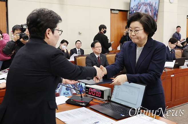 | ▲ 이혜훈 기획예산처 장관 후보자가 23일 국회 재정경제기획위원회에서 열린 인사청문회에서 임이자 위원장에게 선서문을 전달하고 있다. |