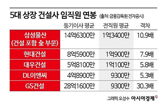 24일 금융감독원 전자공시 시스템에 공시된 2024년 사업보고서에 따르면 5대 상장 건설사(시공능력평가 기준) 중에서 경영진과 직원 간 연봉 격차가 가장 큰 기업은 GS건설이었다. 직원 평균 보수는 9300만원, 등기이사의 평균 보수는 28억1600만원으로 격차가 30.3배에 달했다. 2023년엔 19.3배였다. 같은 기간 대우건설도 등기이사와 직원 간 연봉 격차가 5.1배에서 5.9배로 확대됐다. 반면 건설 포함 4개 부문을 합쳐 평균을 내는 삼성물산(19.6배→10.9배)과 현대건설(11.9배→7.9배),DL이앤씨(7.6배→5.3배)는 임원·직원 간 급여 격차가 축소됐다.