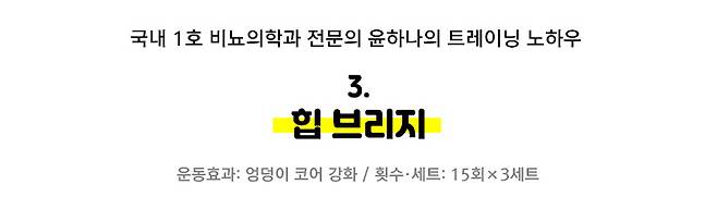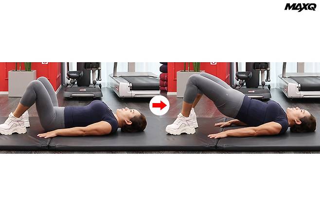 매트 위에 누워 양발을 골반 너비로 벌린다. 손바닥이 아래를 향하게 몸통 옆에 둔다. 최대한 엉덩이가 수축할 수 있을 때까지 골반을 들어 올린다. 최대 수축지점에서 1초 정도 멈춰 운동 효과를 높인 뒤 천천히 준비자세로 돌아온다.