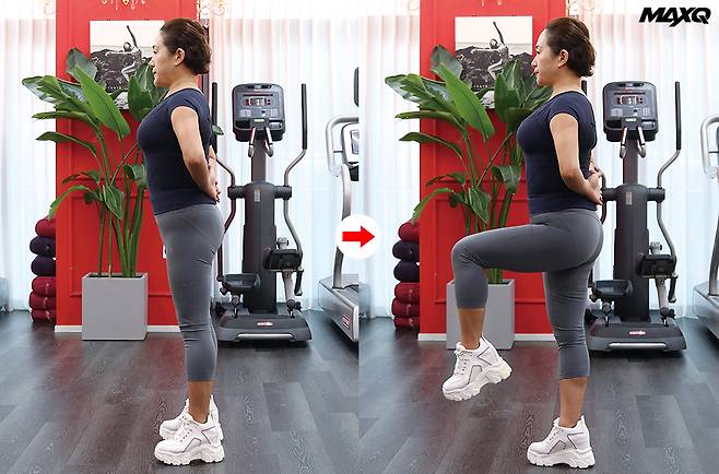 양손을 등 뒤에 두고 양발은 골반 너비로 벌린다. 허리는 곧게 세우고 시선은 정면을 바라본다. 몸이 흔들리지 않도록 주의하며 무릎을 배꼽까지 끌어올린다. 천천히 내린 뒤 같은 방법으로 반대쪽 다리도 실시해야 1회다.