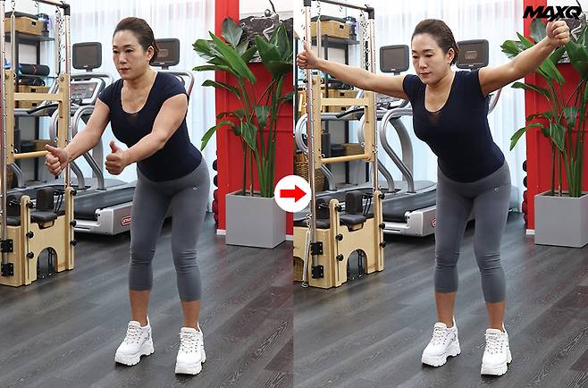 “동작할 때 팔꿈치가 구부러지지 않도록 주의하세요. 상체 각도는 45도를 유지합니다. ”