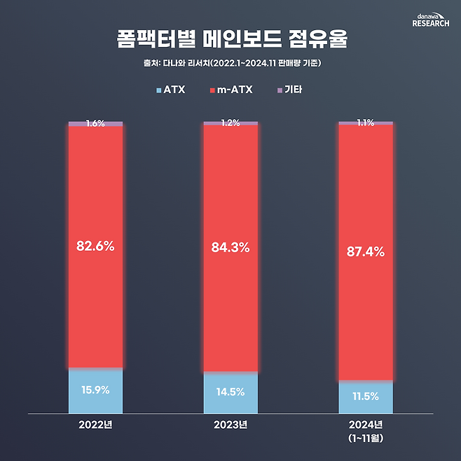 반면, 풀사이즈 ATX 메인보드는 점유율 하락세를 면치 못하고 있다. 2022년 15.9%였던 점유율은 2023년 14.5%, 2024년(1~11월 기준)에는 11.5%로 계속 줄어들고 있다. 이러한 감소세가 지속된다면, ATX 메인보드의 점유율은 곧 10% 아래로 내려갈 가능성도 보인다.