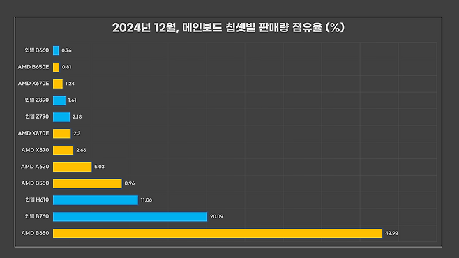 인텔 Z790, Z890, AMD X670E, X870E, X870 같은 고급형 칩셋 메인보드의 판매량 점유율은 모두 합쳐도 채 10%가 안 되며, 인텔 H610, AMD A620 같은 보급형 칩셋 메인보드 또한 합계 16% 수준에 그쳤다. 그야말로 중급 칩셋 메인보드 전성시대다.