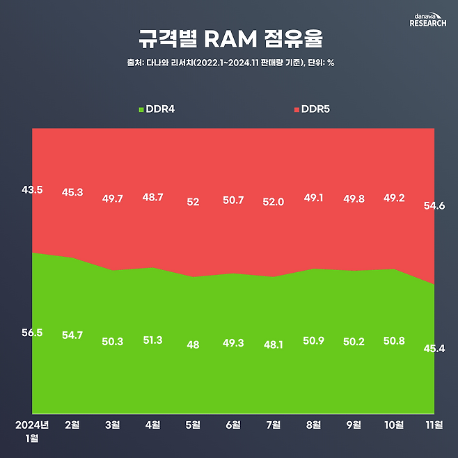메모리 시장에서는 DDR4의 시대가 저물고, DDR5가 본격적으로 부상하고 있다. DDR5는 이미 2021년 말부터 시장에 등장했지만, 초기 보급 속도는 더딘 편이었다. 그러나 최근 들어 점유율이 급격히 증가하며 DDR5가 DDR4를 넘어서는 골든크로스를 달성했다.