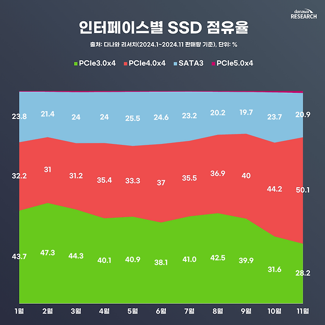 이제 PCI Express 4.0 SSD는 대세다. 여러 브랜드가 경쟁하듯 제품을 출시하다 보니 오픈마켓이나 알리익스프레스, 아마존 특가로 저렴하게 나오는 제품들이 많았다. 특히 많이 팔린 것은 1~2TB 제품들이다. 판매량, 점유율도 수직 상승하여 2024년 1월 32%에서 출발해 11월에는 50.1%로 1위에 등극했다.
