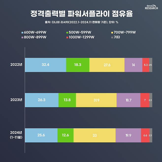 반면, 같은 기간 동안 500W대 파워의 점유율은 18.3%에서 12.6%로 줄었고, 600W대 파워 또한 32.3%에서 25.6%로 하락했다.