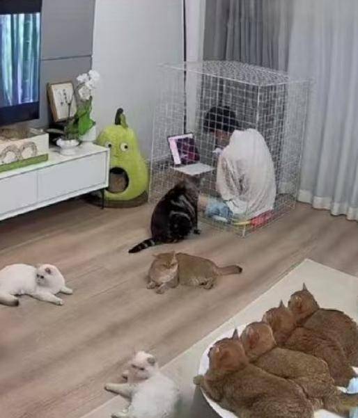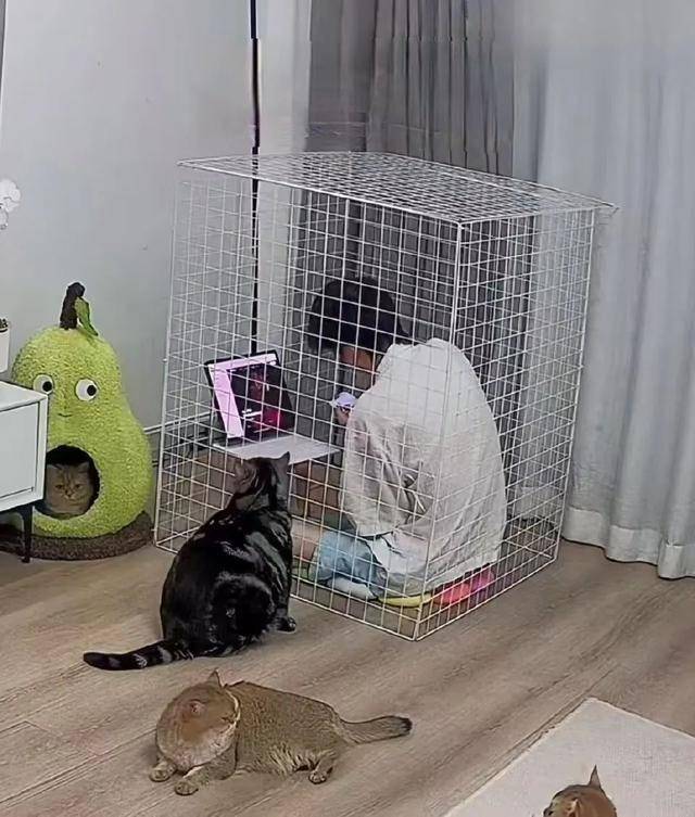 그래서 어떤 해결책을 선택했을까요? 고양이들을 방에 가두는 대신, 놀랍게도 자신이 방에 들어갔습니다! 고양이들이 볼 수도 있고 냄새도 맡을 수 있지만, 음식에는 손댈 수 없게 만든 기발한 방법이네요.