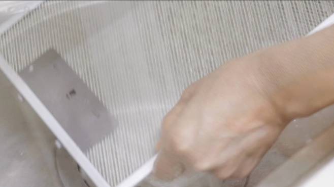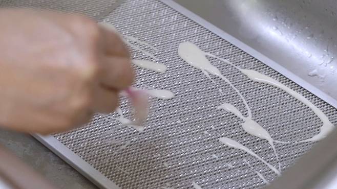 그리고 섞은 재료를 주방후드 필터에 골고루 뿌리고, 솔을 이용해 닦아주면 돼요. 이렇게 하면 맥주에 있는 알코올이 기름을 분해하고 밀가루가 쏙쏙 흡수하여 보다 쉽게 닦을 수 있어요.