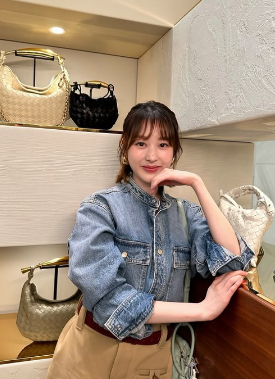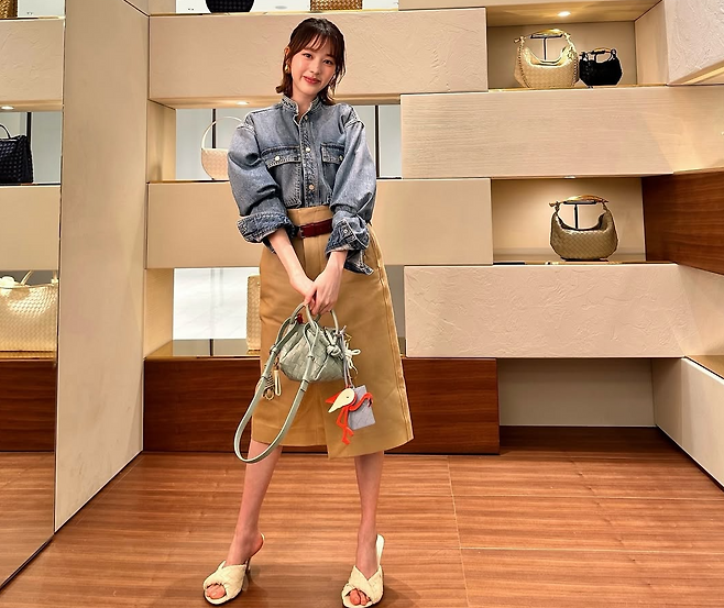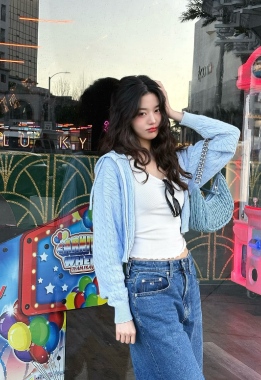 위에 하늘색 니트 가디건을 걸쳐서 캐주얼하면 산뜻한 분위기를 보여줬는데요. 포즈로 발랄함을 뽐내기도 했어요. 가방은 캐주얼한 체인 데님백을 들어 보였네요!