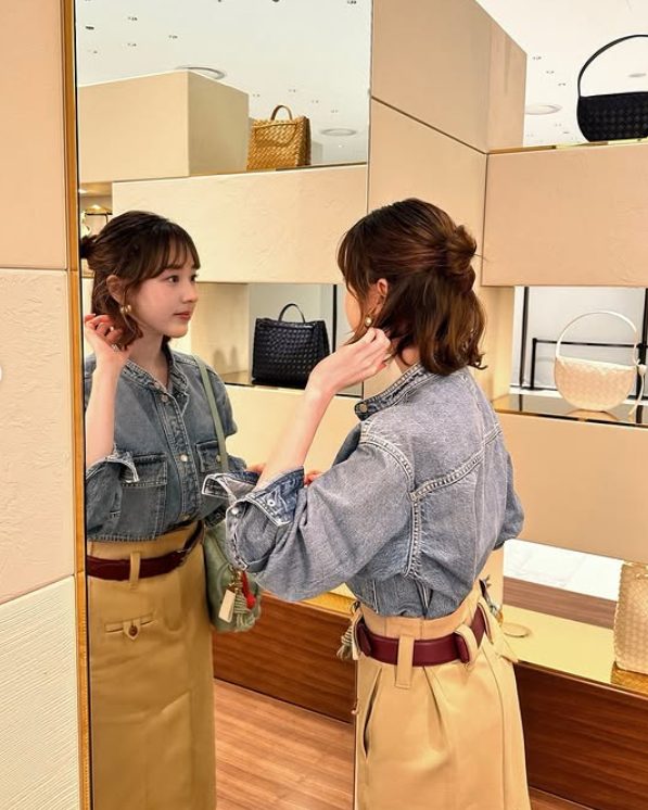 먼저 첫째 장다아 님은 블루 셔츠에 베이지 스커트로 캐주얼하면서 페미닌 한 일상룩을 보여줬어요. 머리는 단발에 반묶음으로 우아한 분위기를 뽐냈죠~