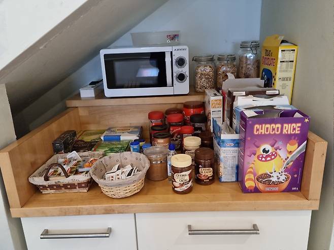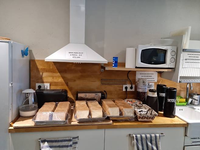유료로 조식을 제공하는 알베르게도 있지만 주로 빵과 토스트, 씨리얼과 주스 정도로 간단하게 제공되며 조식이 제공되는 알베르게가 많지 않기 때문에 전날 장봐온 음식들로 간단하게 아침식사를 한 후 걸으면서 먹을 간식과 짐을 꾸린 후 출발하는것이 알베르게에서의 아침 풍경입니다.
