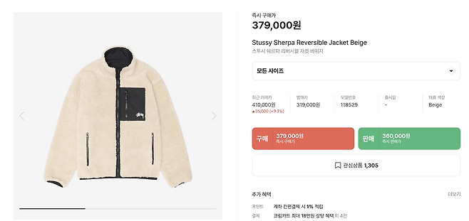 현재 희소성으로 리셀가 상승 했는데요 단종된 후리스를 착용하며 리셀가가 40만 원 이상으로 급상승 했습니다.