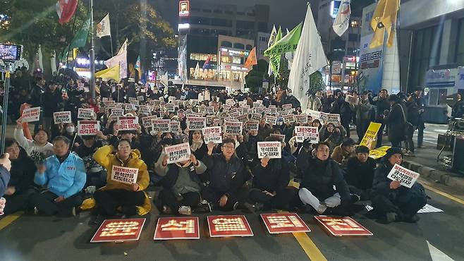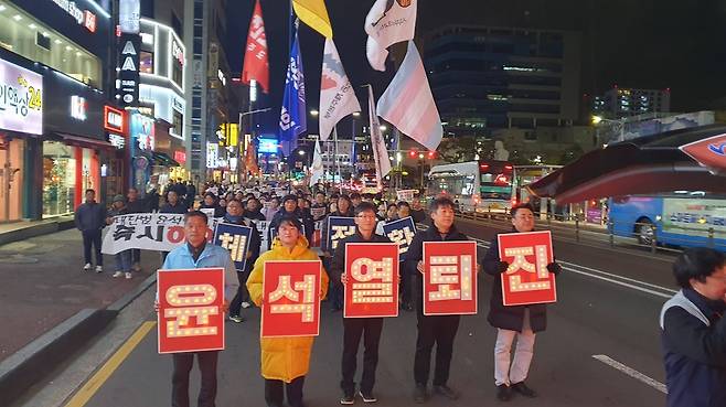 | ▲ 12월 6일 제주 시청에서 열린 윤석열 즉각 퇴진 요구 제주도민대회를 마친 참가자들이 제주 시청에서 행진하는 모습 |