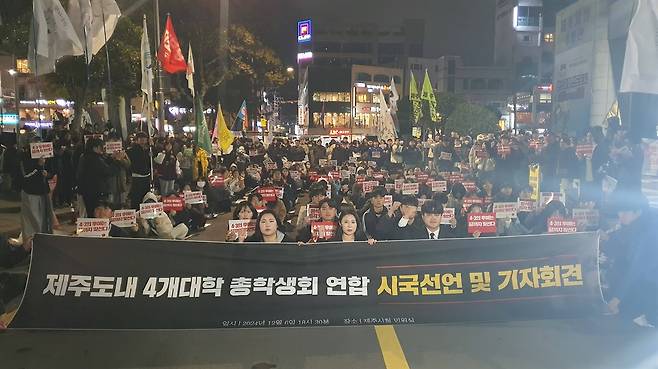 총학생회 연합은 "제주는 부당한 공권력, 극악무도함의 정점인 4.3의 광풍으로 인해 피로 얼룩진 투쟁의 역사를 간직하고 있다"며 "우리 선배 총학생회들은 국민주권이 부여한 민주주의의 가치를 지키고 국가폭력의 혈흔인 제주 4.3의 진상규명을 위해 맞서 싸워왔다. 그것이 우리가 이 자리에 선 이유"라고 시국선언 배경을 밝혔습니다.
