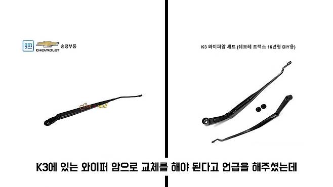 더 뉴 트랙스 차주님들도 말씀하시는 게 유리에 와이퍼 잔상이 남고 그래서 K3에 있는 와이퍼 암으로 교체를 해야 된다고 언급을 해주셨는데, 이 차량도 동일하게 바꿨고, 또 아베오랑 트랙스 와이퍼 암이 전용 와이퍼를 쓰게 돼있어요. 그래서 저희 마트 같은 데 가면 와이퍼 팔잖아요. 그거를 쓸 수가 없어요. 전용을 써야 되기 때문에요. 근데 K3 걸 끼면 마트나 이런 데서도 쉽게 구매할 수가 있는 거죠.