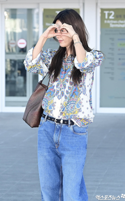 블라우스: 화려한 페이즐리 패턴의 블라우스는 보헤미안 스타일을 대표하며, 채정안의 화려한 이목구비를 더욱 돋보이게 합니다.