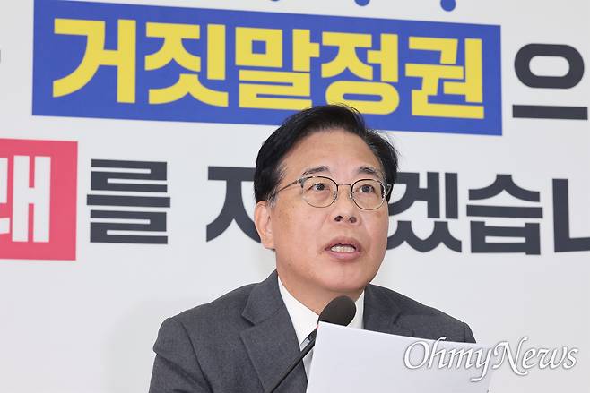 | ▲ 송언석 국민의힘 원내대표가 18일 서울 여의도 국회에서 현안 관련 기자간담회를 하고 있다. |