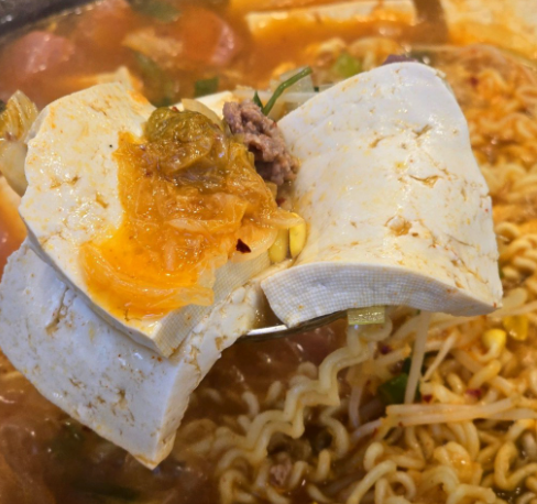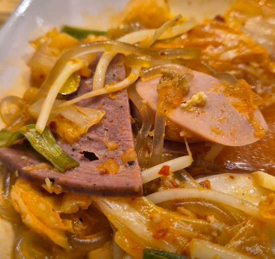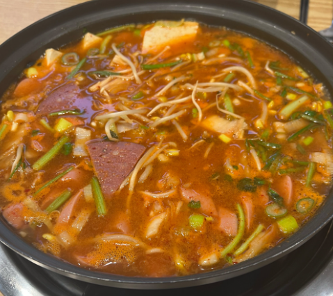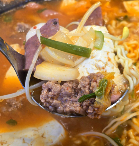 푸짐한 구성: 햄, 소시지, 채소, 국물 맛이 일품. 추가 토핑으로 취향껏 즐길 수 있음