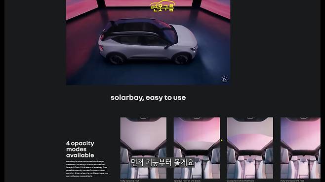 솔라베이 글라스의 가장 큰 특징은 필요에 따라 투명도를 조절할 수 있다는 점이다. 공개된 정보에 따르면 솔라베이는 2열만 불투명 모드, 1열만 불투명 모드, 그리고 완전 투명 모드 등 다양한 설정이 가능하다. 이를 통해 운전자와 탑승자는 상황과, 날씨에, 그리고 선호도에 따라 실내 분위기를 자유롭게 변경할 수 있다.