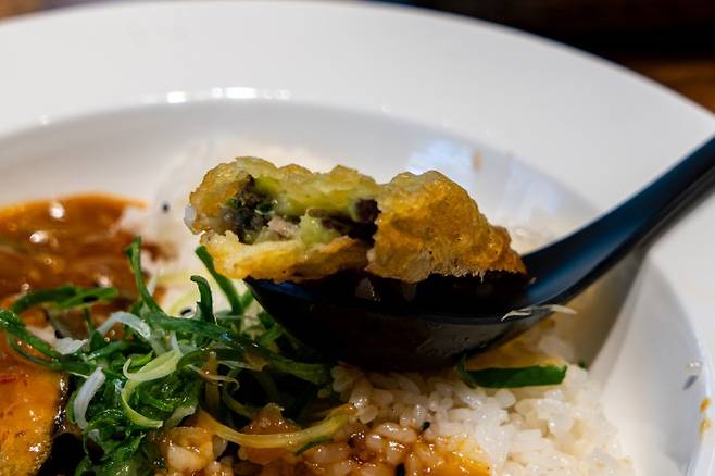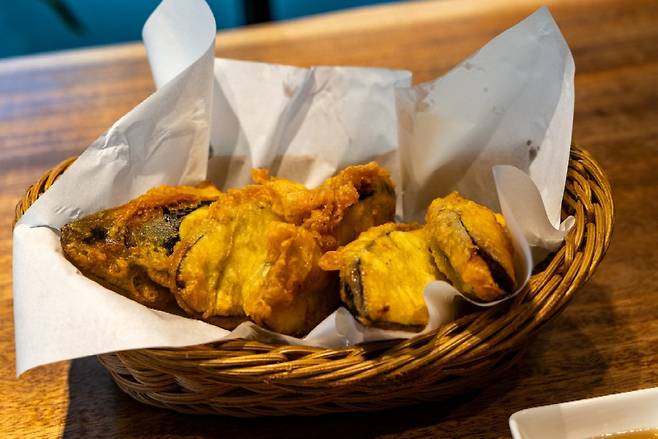 가지의 색다른 변신을 경험할 수 있는 가지만두 또한 주목할 만한 메뉴다. 일반적인 만두와 피로 가지를 사용하고 그 속에 다진 고기 등을 넣은 만두 스타일이다. 그런데 얼핏 이게 만두인가 싶기는 했다. 사실은 가지튀김에 더 가깝지 않은가 싶다. 메뉴명에는 가지만두이지만 가지만두튀김이 더 적합한 메뉴명이 아닐까 싶다. 한입 베어 물면 바삭한 가지튀김을 넘어 부드러운 가지와 고기의 속 조합이 무척 인상적이다. 일단, 어디에서도 맛보지 못한 가지요리의 새로운 해석이 좋았다.