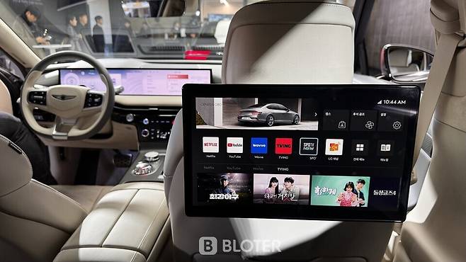 이번에 공개된 제네시스 후석 인포테인먼트 시스템 디스플레이 크기는 14.6인치로 기존 G90 뒷좌석 디스플레이(10.2인치)보다 크다. 테슬라 모델 3 센터페시아 디스플레이(15인치)와 비슷한 크기로 보면 된다. 기존 G90 뒷좌석 디스플레이는 내비게이션, 골프장 정보, 차량 설정 등을 진행할 수 있지만 14.6인치 후석 인포테인먼트 시스템은 넷플릭스, 유튜브, 웨이브, 티빙, 스포티비 나우, LG채널 등 총 6개의 스트리밍 서비스의 앱 아이콘 위주로 구성됐다. 특히 디스플레이 아래쪽에는 각 스트리밍 서비스별 주요 콘텐츠 포스터도 살펴볼 수 있었다.