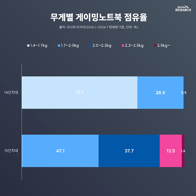 다나와 리서치에 따르면 지난 1∼7월 판매된 14인치 게이밍노트북 중, 절반 이상이 무게가 1.4∼1.7kg였다. 판매량 TOP5의 평균 무게는 1.65kg이다. 1.65kg는 일반 노트북에서도 흔히 볼 수 있는 무게이며, 게이밍노트북 치고는 굉장히 가벼운 수준이다. 반면 15인치 게이밍노트북은 1.7∼2.0kg 제품이 가장 많은 점유율을 기록했으며, 2.0∼2.3kg에 해당하는 제품도 다수 판매되었다.