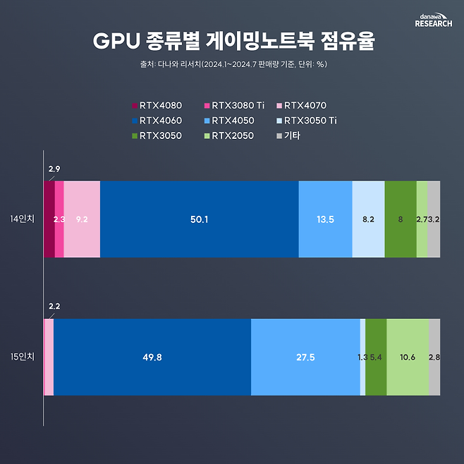 GPU도 마찬가지다. 14인치 게이밍노트북은 엔비디아 RTX 4060 이상의 고성능 제품을 탑재한 제품 위주로 되었다. 판매된 제품 절반이 RTX 4060을 탑재한 것은 15인치 게이밍노트북과 비슷하나, 14인치의 경우 RTX 4080, RTX 3080 Ti, RTX 4070와 같이 더 고사양의 그래픽카드가 탑재된 제품이 다수 판매되었다. 반면, 15인치는 RTX 4050 이하의 그래픽 성능을 탑재한 제품도 여럿 판매되었다.