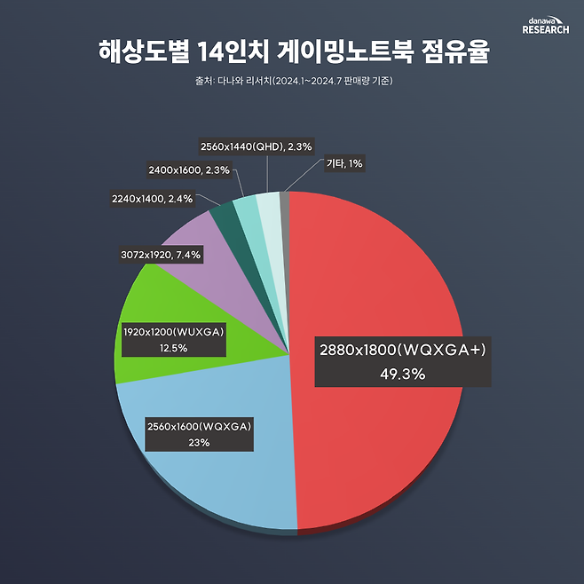 14인치 게이밍노트북도 마찬가지다. 2.3% 점유율을 기록한 2560x1440(QHD)를 제외하면, 모두 16:10 비율의 고해상도 제품이 판매되었다. 그중 절반은 2880x1800(WQXGA+) 해상도였는데, 대표격인 ASUS ROG 제피러스 G14뿐 아니라 HP 오멘 14 슬림, MSI 크리에이터 M14 등 14인치 게이밍노트북 다수가 적용했기 때문으로 보인다. 3072x1920와 같은 초고해상도 제품도 7.4%나 되었다. 반면, 15인치는 1920x1080(FHD) 해상도가 전체의 83.5%나 차지했다.