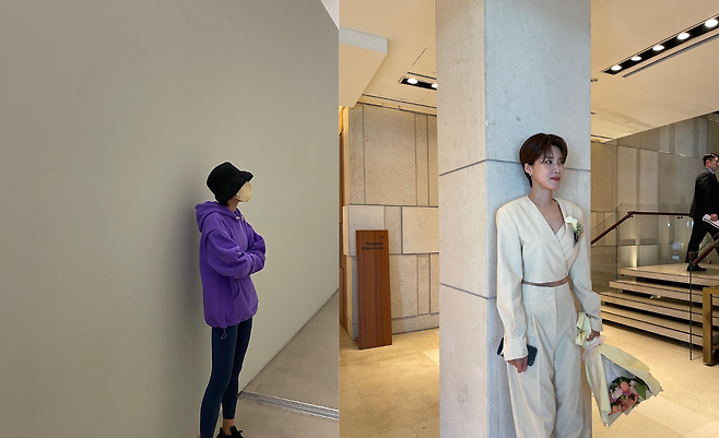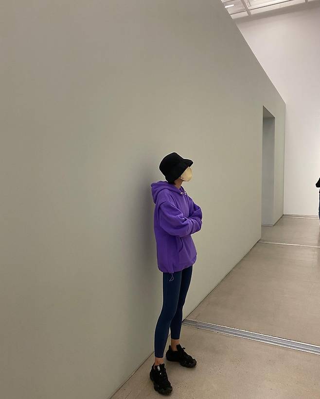 퍼플 컬러의 오버사이즈 후드티와 블랙 레깅스를 매치해 트렌디한 애슬레저룩을 완성했다. 여기에 볼륨감 있는 블랙 스니커즈와 버킷햇을 더해 스트릿 무드를 강조했다.