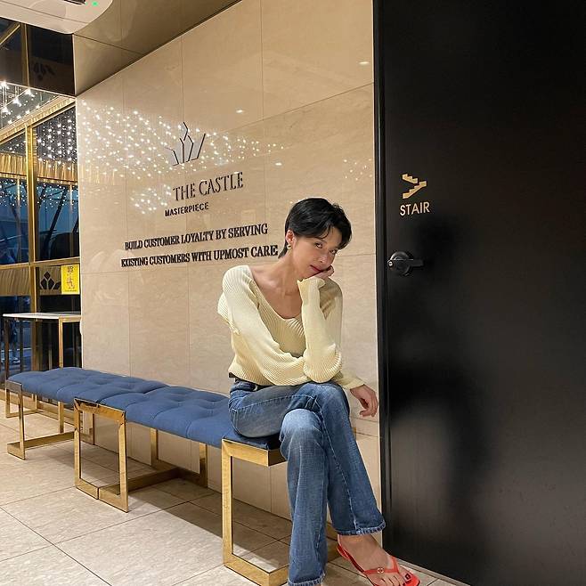 크림색 니트 카디건과 청바지를 매치한 편안한 데일리룩을 선보이고 있다. 여기에 레드 컬러의 슈즈로 포인트를 주어 세련된 분위기를 연출했다. 특히 니트의 부드러운 질감과 청바지의 캐주얼함이 조화롭게 어우러져 있다.