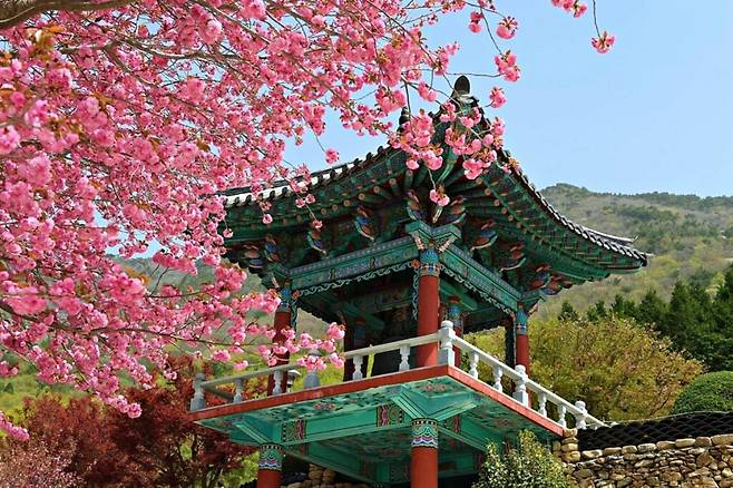 ‘사천 청룡사’는 4월이 되면 연분홍 겹벚꽃과 고즈넉한 사찰이 어우러져 아름다운 경관을 자아낸다.