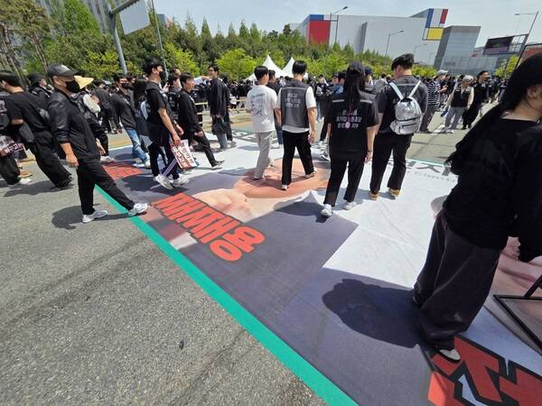집회 현장 바닥에는 이재용 삼성전자 회장과 전영현 부회장, 노태문 사장 등 경영진의 사진이 붙어 있었다. 노조원들은 이들의 얼굴을 짓밟으며 원색적인 욕설을 내뱉기도 했다. 또 이 회장 사진 아래에는 ‘째째용’이라는 비난 섞인 문구를 적어놓아 눈살을 찌푸리게 했다.