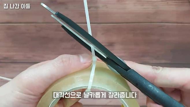 📌 준비물: 테이프, 케이블타이 테이프 중심에 케이블타이를 묶어주세요. 케이블타이 끝을 사선으로 날카롭게 잘라줍니다. 이제 테이프를 자를 때, 케이블타이 끝을 이용해보세요! 🔹 테이프를 깔끔하고 빠르게 자를 수 있어요.