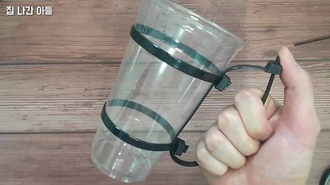 컵 상단과 하단에 각각 케이블타이를 하나씩 묶습니다. 튀어나온 부분은 잘라내 주세요. 그리고 상·하단 케이블타이를 연결할 수 있도록, 안쪽에도 케이블타이를 하나씩 더 묶어줍니다. 손잡이 완성!