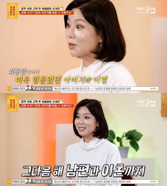 6년 전 아버지를 여의었고, 그다음 해에는 이혼했다는 것. 손정은은 2011년 한 살 연상의 사업가와 1년여의 열애 끝에 결혼식을 올렸으나, 퇴사 직전인 2020년에 이혼하며 각자의 길을 걷게 되었다.