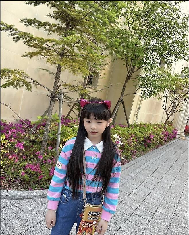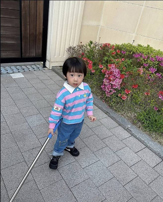 희율과 희우 남매는 핑크와 블루 스트라이프의 긴팔 티셔츠에 각각 데님 팬츠를 매치해 사랑스러운 남매 트윈룩을 완성했습니다.