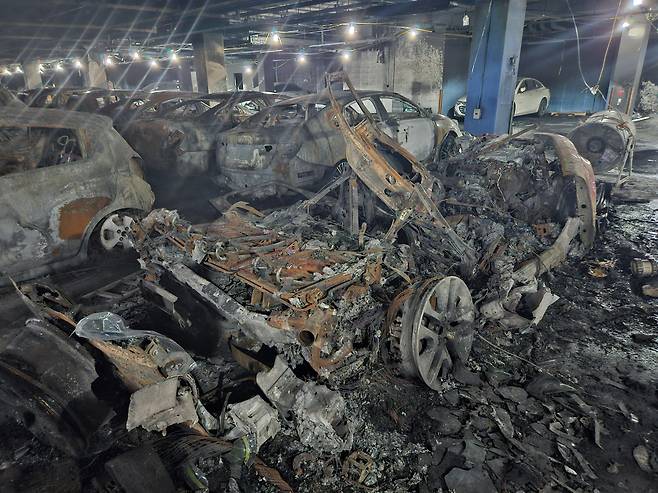 지하 1층 주차장으로 내려가니 대부분 차량이 주차장 밖으로 옮겨져 있었지만 아직 그을음과 분진이 가득했다. 화재가 발생한 지점에는 전소된 차량들이 방치돼 있었다. 차량에는 차량 제조회사, 차량번호 등을 페인트로 기록해둔 흔적이 보였다.