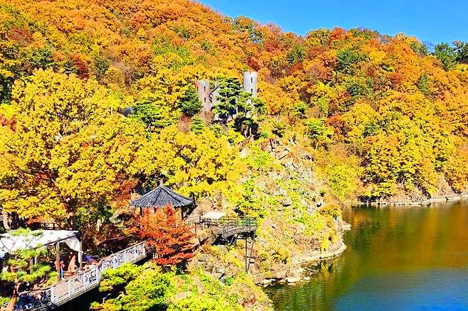 대청호를 배경으로 한가을 단풍 명소로, 다양한 색채의 단풍이 물들어 장관을 이룹니다.