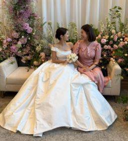 랩 스타일의 실루엣은 허리를 자연스럽게 감싸 단아하면서도 사랑스러운 하객룩을 완성했고, 부케와도 조화를 이루며 부드러운 분위기를 자아냈습니다.
