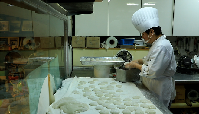 쎄느제과의 찹쌀떡은 특별한 방식으로 만들어져요. 하루 세 번, 정해진 시간마다 반죽을 하고 떡을 빚는다고 해요. 찹쌀은 상주산만 사용하고, 세 번에 걸쳐 곱게 갈아내 부드러운 식감을 내죠. 거기에 구운 밤과 좁쌀을 넣어 씹을수록 고소한 풍미가 퍼지는, 단순한 떡이 아니라 하나의 작품 같은 맛이 완성돼요. 이 정성은 기계로는 절대 흉내 낼 수 없는 영역이겠죠.
