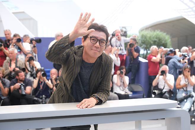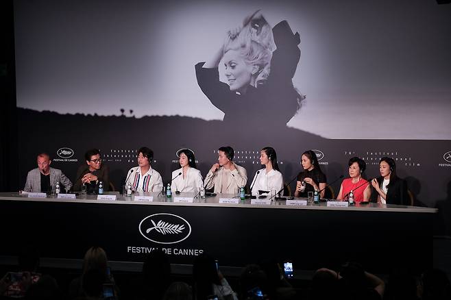 <거미집>은 1970년대, 다 찍은 영화 ‘거미집’의 결말만 다시 찍으면 걸작이 될 거라 믿는 김감독이 검열, 바뀐 내용을 이해하지 못하는 배우와 제작자 등 미치기 일보 직전의 악조건 속에서 촬영을 밀어붙이며 벌어지는 일들을 그리는 영화다. 이날 포토콜은 프랑스 현지 시간 기준 5월 26일(금) 공식 기자회견에 앞서 오후 12시 30분에 진행됐다. 김지운 감독을 비롯해 송강호, 임수정, 오정세, 전여빈, 정수정, 박정수, 장영남까지 총 8명이 참석했다.